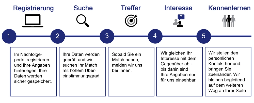 Für Nachfolgeinteressierte und Unternehmen soll der Matchingprozess möglichst einfach sein. Dazu hat die unterstützende Nachfolgezentrale Berlin fünf Schritte vorgesehen.